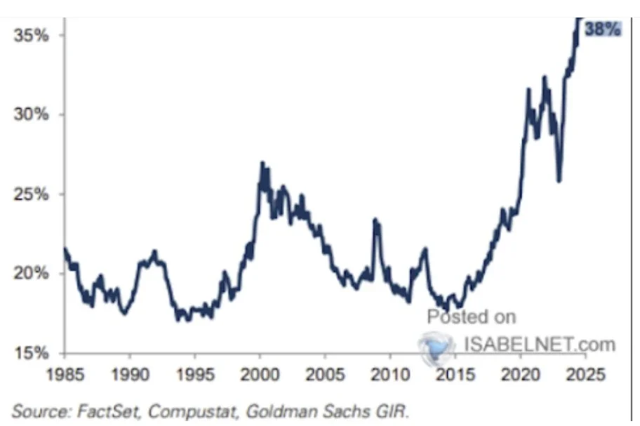 “Magnificent Seven” is a term that has come to represent the seven dominant technology companies in the United States. These companies are: Apple, Meta (Facebook), Alphabet (Google), Nvidia, Microsoft, Tesla and Amazon. The chart on the left shows that their combined value is close to 40% of the value of all the largest businesses in the US. Much attention is paid to these seven stocks for many reasons, the least of which is simply their sheer value. Consider, for example, the value of Apple Inc. It would cost you $5.2 trillion CAD to purchase the entire business. If you added up the value of ALL the companies listed on the TSX (Canadian stock market), it would total $4.2 trillion CAD. To be clear, if you owned one business (Apple Inc.) and sold it to someone else, you would have enough money to purchase EVERY publicly-traded business in Canada (all the banks, railroads, pipelines, energy companies etc.) and still have $1 trillion left over for spending money . We remain concerned that the value of these seven companies is so overwhelmingly high. I should also note that EdgePoint does not currently hold any shares of the magnificent seven in its portfolios. In the index funds (RBC US Equity Index), the magnificent seven are dominant.